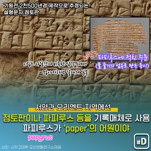 서양과 오리엔트 지역에서는 점토판이나 파피루스 등을 기록매체로 사용했는데요. 점토판은 고대문명 발상지인 메소포타미아에서 나왔지요. 점토판은 기원전 3천 년경부터 기원후 2∼3세기까지 주로 사용됐습니다.
