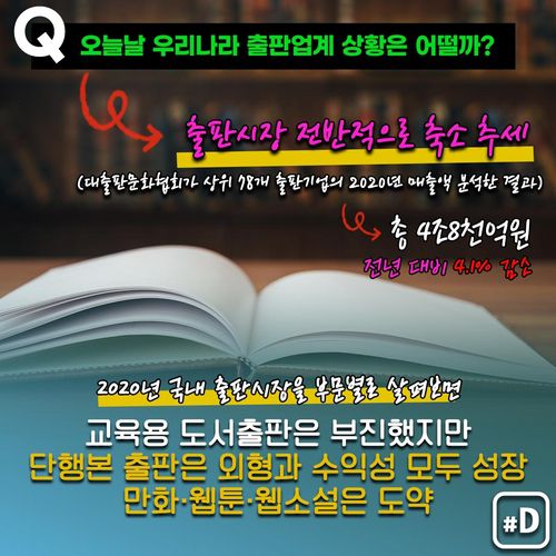 출판시장 규모는 전반적으로 축소되는 추세입니다. 2020년 국내 출판시장에서는 교육용 도서 출판은 부진했지만, 단행본 출판은 외형과 수익성 모두 성장했고 만화·웹툰·웹소설은 비약적 성장을 보인 것으로 나타났습니다.