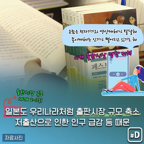 세계 최대 출판시장 규모를 지닌 미국은 나름 '호황'이지만 출판시장 규모 세계 2~3위인 일본은 우리나라처럼 출판시장 규모가 갈수록 축소되는 추세입니다. 출판업계는 일본의 경우 우리나라와 비교해 출판시장 감소 규모가 비슷하고 저출산으로 인한 인구의 큰 감소 폭 등이 작용하는 것으로 풀이합니다.