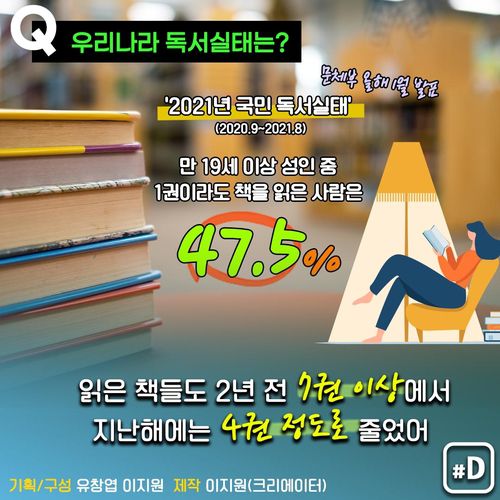 문화체육관광부가 올해 1월 발표한 '2021년 국민 독서실태'에 따르면 2020년 9월부터 지난해 8월까지 만 19살 이상 성인 연령층에서 1권이라도 책을 읽거나 들은 사람의 비율인 연간 종합독서율은 47.5%로 8.2%포인트 감소했습니다. 읽은 책들도 2년 전엔 7권 이상이었으나 지난해에는 4권 정도였습니다.