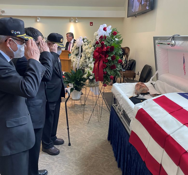 6.25 참전유공자회 워싱턴지회 손경준 회장 등 참전 유공자들이 22일(현지 시각) 미 메릴랜드주 프레데릭타운에서 열린 웨버 대령 장례식장에서 그를 향해 경례하고 있다. /이민석 특파원