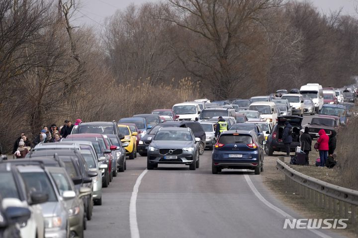 [우도브네=AP/뉴시스] 26일(현지시간) 우크라이나 피난민 차량이 우크라이나 우도브네 인근 마야키-우도브네 국경을 넘어 몰도바로 가기 위해 줄 서 있다. 유엔난민기구는 러시아의 침공 이후 지금까지 약 12만 명이 우크라이나를 탈출해 주변국으로 유입됐다고 밝혔다. 2022.02.27. |