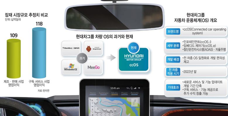 현대차그룹이 '커넥티드카 운용체계(ccOS)'로 미래차 시대를 준비한다. 커넥티드카를 대상으로 지속적인 서비스와 기능 업데이트를 제공해 편의성을 높이고, 동시에 새로운 수익 기반을 마련한다. 자동차 플랫폼으로 서비스 매출을 올리는 회사로 거듭나기 위한 포석이다.
