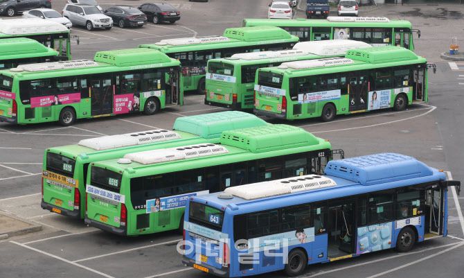 [이데일리 이영훈 기자] 지난 25일 서울 양천공영차고지에서 운행을 마친 차량들이 주차돼 있다.
