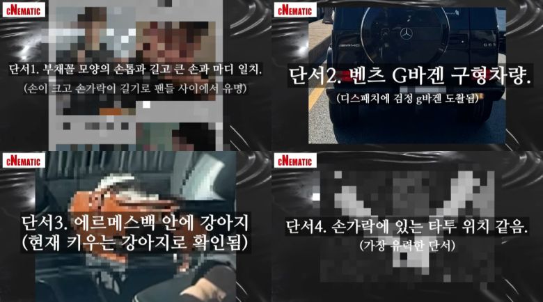 그가 공개한 단서 속 A 씨는 '부채꼴 모양의 손톱과 길고 큰 손(손이 크고 손가락이 길기로 팬들 사이에서 유명)', '외제 차 SUV 구형 차량', '명품 가방 속 강아지(현재 키우는 강아지로 확인됨)', '손가락에 있는 문신 위치가 같음(가장 유력한 단서)' 등의 특징을 가지고 있습니다.