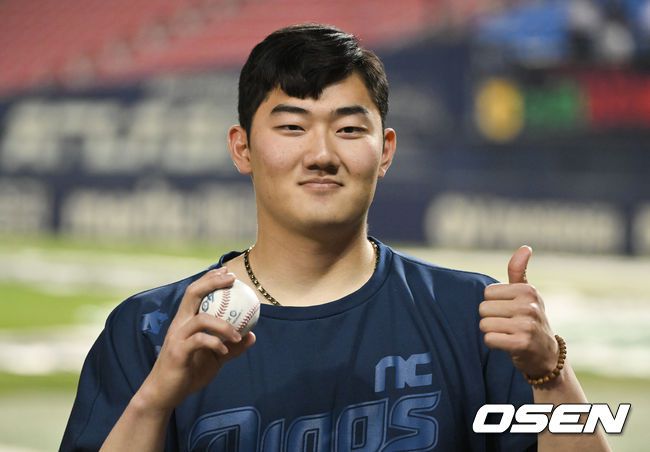경기종료 후 데뷔 첫승 거둔 NC 김시훈이 기념구와 함께 포즈를 취하고 있다. 2022.04.28 / soul1014@osen.co.kr