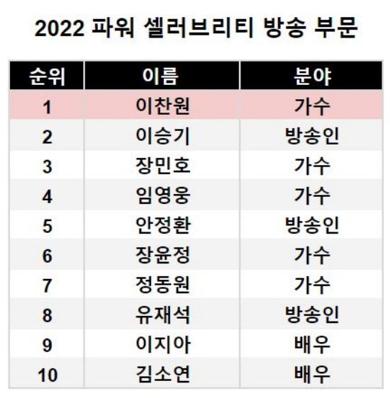 말 그대로 소득과 활약을 종합적으로 합산한 지수인 셈. 그런 '코리아 파워 셀러브리티' 지수에서 이찬원은 지난해보다 무려 6계단 상승해 솔로 가수 중 1위에 해당하는 TOP5에 올랐다. 이 지수의 1위부터 4위는 각각 BTS, 블랙핑크, 손흥민, 류현진 등 글로벌 스타가 차지했다.
