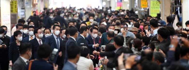 /김명년[중부매일 김명년 기자] 윤석열 대통령 당선인이 29일 충북 청주시 육거리종합시장에서 시민들과 인사를 나누고 있다.