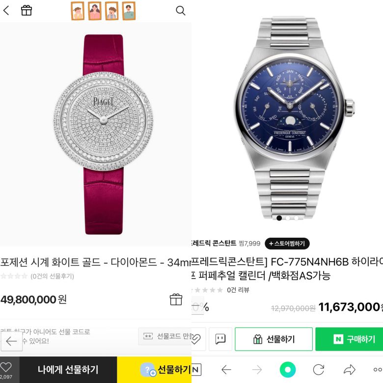 왼쪽부터 카카오톡 선물하기와 네이버쇼핑 럭셔리관 이용화면. 소비자는 양사 플랫폼에서 최대 5000만원의 명품 시계를 구매할 수 있다. /앱 캡처