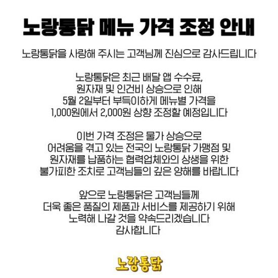 노랑통닭은 공식 홈페이지에서 안내문을 통해 “최근 배달 앱 수수료, 원자재 및 인건비 상승으로 인해 메뉴별 가격을 1000원에서 2000원 상향 조정한다”고 밝혔다.