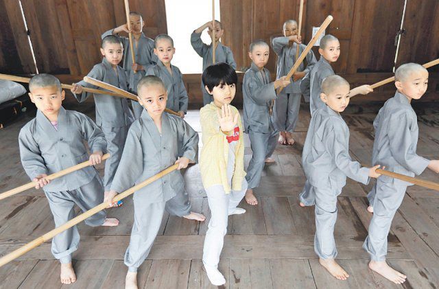 어린이날인 5일 개봉하는 국산 어린이영화 ‘액션동자’에서 주인공 진구(홍정민)와 동자승들이 무술시범을 보이고 있다.