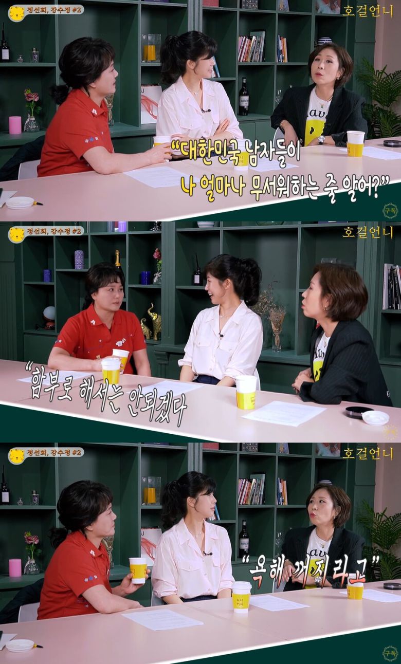 정선희는 5일 이경실의 유튜브 채널 '호걸언니 이경실'을 통해 공개된 영상에서 "대한민국 남자들이 나 얼마나 무서워하는 줄 아니"라고 해 웃음을 자아냈다.