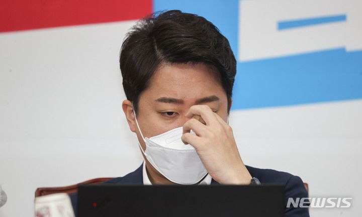 [서울=뉴시스] 최진석 기자 = 이준석 국민의힘 대표가 4일 서울 여의도 국회에서 열린 최고위원회의에서 마스크를 고쳐쓰고 있다. (공동취재사진) 2022.05.04. photo@newsis.com |