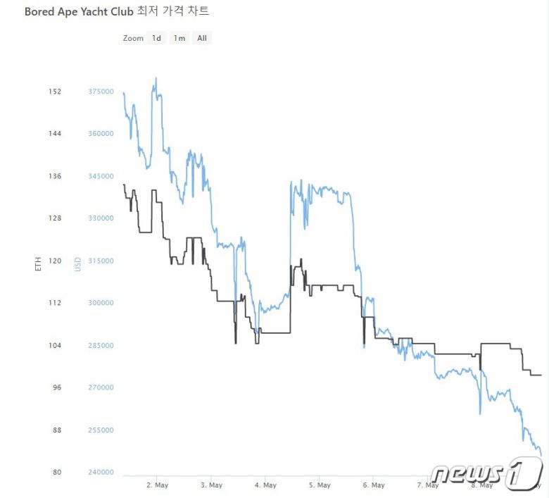 BAYC NFT의 바닥가(최저가)가 지난 2일 이후 지속적으로 하락하고 있다. 코인게코 사이트 갈무리.© 뉴스1