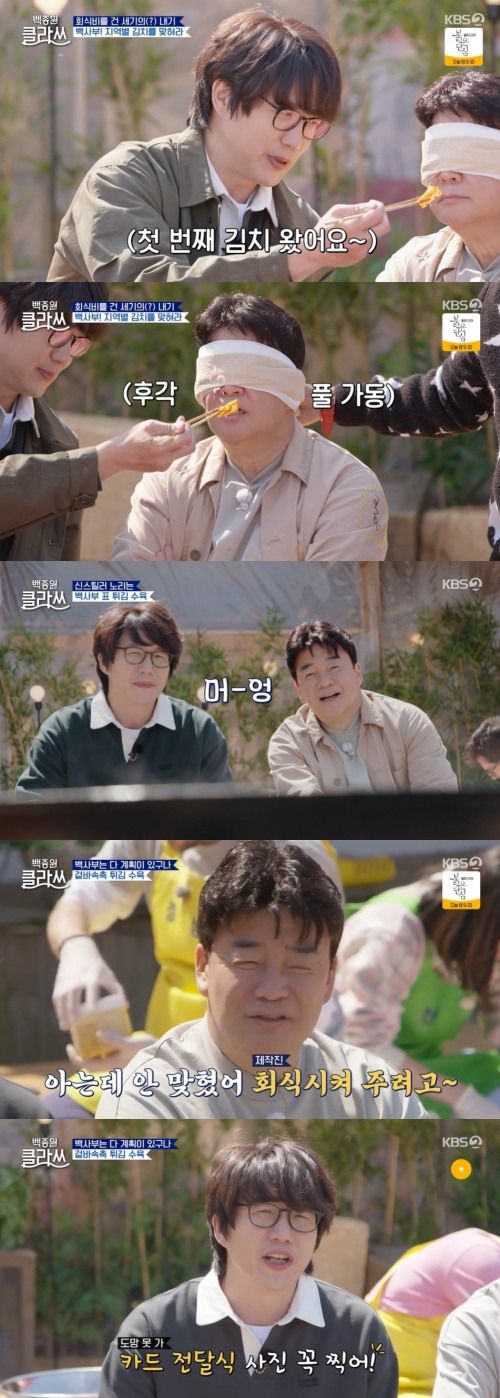 백종원은 불리한 내기임에도 제안을 받아들였고, 행주로 눈을 가리고 김치를 맛봤다. 지역별 김치 전문가들도 “이건 못 맞춘다”고 예상했다. 백종원은 “그냥 맛있는디?”라며 “충청도, 경기도, 경상도, 전라도”라고 이야기했다. 성시경은 “어떻게 하죠? 하나도 못 맞췄다”라며 안타까워해 웃음을 안겼다.