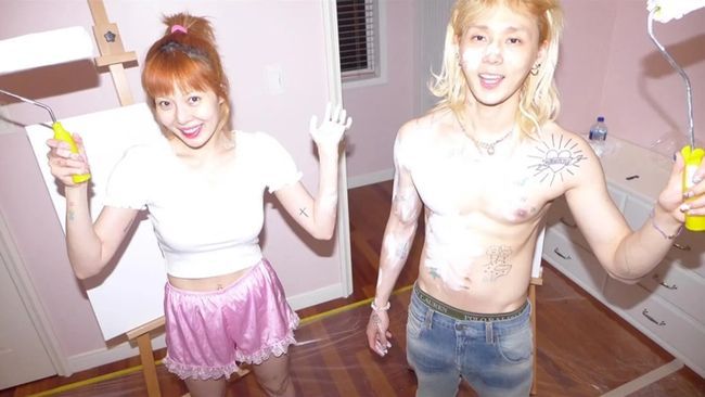 현아는 편안한 차림으로 페인트칠을 돕고 있다. 두 사람은 페인트칠을 하면서도 애정 행각을 멈추지 않았다.