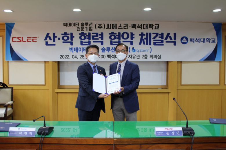 산학협력 협약을 체결한 문상연 씨에스리 이사(오른쪽)와 이경직 백석대 부총장. |