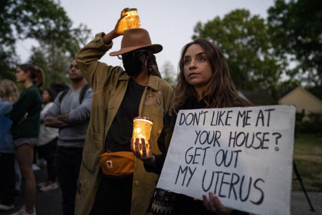 10일(현지시간) 미국 버지니아주 알렉산드리아에 위치한, 낙태 권리를 뒤집는 판결 초안을 작성한 것으로 알려진 사무엘 알리토 미국 대법관의 집 앞에서 낙태권 지지자가 시위하고 있다. 알렉산드리아/EPA연합뉴스 |