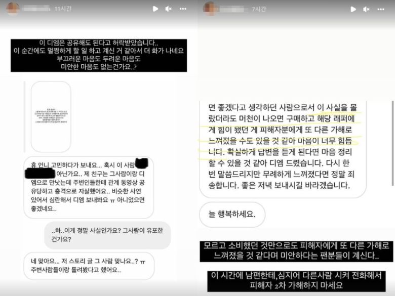 팬의 심정을 공유하며 던밀스의 아내는 "이 시간에 남편(던밀스)한테, 심지어 다른 사람 시켜 전화해서 피해자 2차 가해하지 말라"고 목소리를 높였습니다.