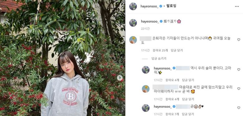 하연수의 지인은 해당 게시물에 "은퇴 각(분위기)은 기자들이 만드는 것 아니냐며. 귀여워 오늘도"라고 댓글을 남겼다. 이에 하연수는 "역시 우리 OO뿐이다. 고마워"라고 화답했고, 지인은 "마음대로 써진 글에 마음 쓰지 말고 우리 마이웨이 하자"고 응원했다.