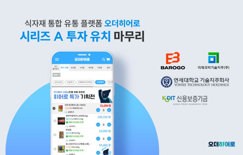 식자재 통합 유통 플랫폼 ‘오더히어로’를 운영하는 딜리버리랩이 바로고, 미래과학기술지주, 연세대학교기술지주, 신용보증기금으로부터 50억 원 규모 시리즈 A 라운드 투자 유치를 마무리했다. |
