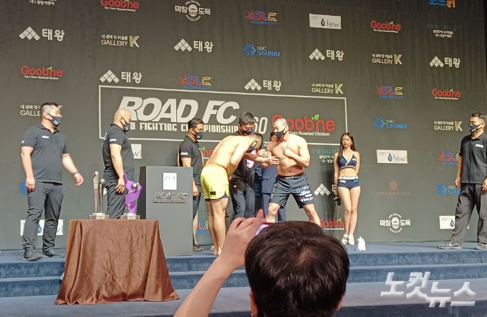 계체량에 실패한 권아솔(왼쪽)이 남의철에게 고개 숙여 인사하고 있다. 노컷뉴스