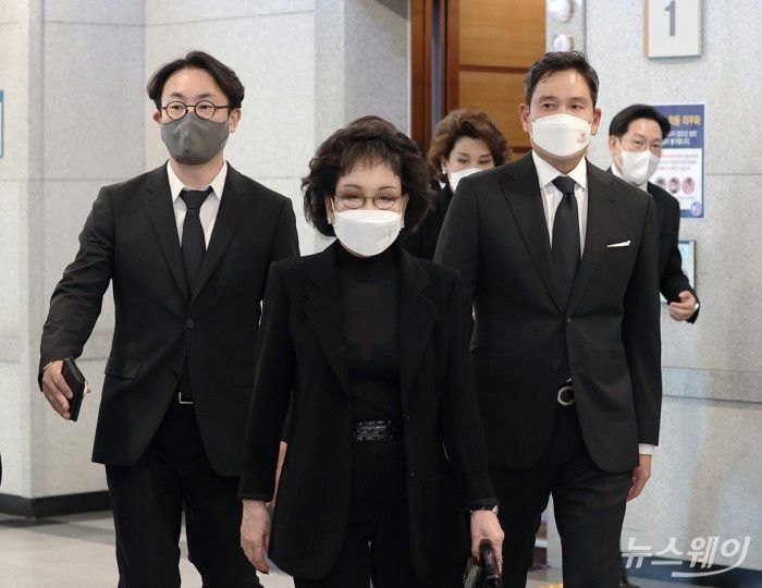 장례식장에는 한지희 씨가 먼저 도착했다. 이어 이명희 회장, 정용진 부회장, 정유경 총괄사장이 도착해 서로 손을 잡고 1분여간 인사를 나눴다. 이명희 회장이 마스크를 갖춰 쓰자 정 부회장은 어머니 이명희 회장을 로비로 모셨다.