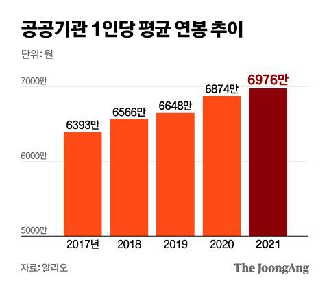 이는 대기업보다 많고 중소기업의 두 배가 넘는 수준이다. 통계청이 2월 발표한 ‘2020년 임금근로일자리 소득(보수) 결과’를 보면 대기업과 중소기업 근로자의 월평균 소득은 529만원과 259만원으로 연간으로 환산하면 각각 6348만원과 3108만원이다. 2020년 기준 공공기관 370곳의 평균 연봉은 6874만원으로 대기업보다 8.3% 많았다. 중소기업과 비교하면 2.2배 수준이다. ‘2021년 임금근로일자리 소득(보수) 결과’는 아직 집계되지 않았으나, 지난해에도 이와 비슷한 격차를 유지할 것으로 추산된다.