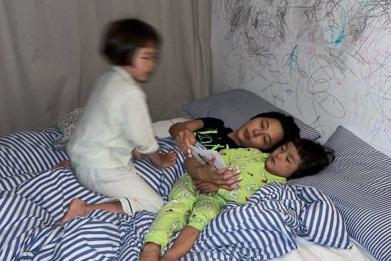 공개된 사진 속 김나영은 두 아들과 함께 침대 위에서 즐거운 시간을 보내고 있는 모습. 아이들 낙서로 가득한 벽이 인상적이다. 낙서를 했다고 혼내지 않고 그대로 낙서를 하도록 둔다고.