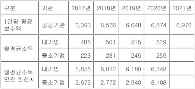 공공기관의 연봉은 대기업보다 많고 중소기업의 2배가 넘는 수준이었다. 통계청이 지난 2월 발표한 ‘2020년 임금근로일자리 소득(보수) 결과’에 따르면 대기업과 중소기업 근로자의 월평균 소득은 529만원과 259만원으로 연간으로 환산하면 6348만원과 3108만원이었다. 2020년 기준 공공기관 370곳의 평균 연봉은 6874만원으로 대기업보다 8.3% 많았다.