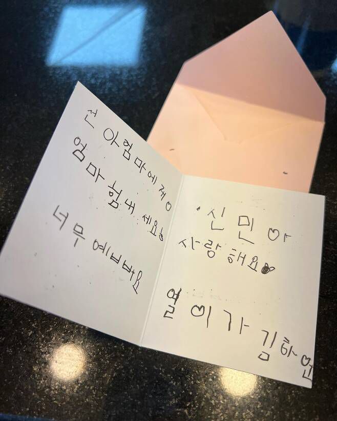 '선아 엄마에게. 엄마 힘내세요. 너무 예뻐요. 신민아 사랑해요. 열이가. 김하언'이라고 적힌 메시지 카드가 눈에 띈다.