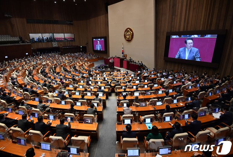 윤석열 대통령이 16일 서울 여의도 국회에서 열린 본회의에서 코로나19 손실보상을 위한 추가경정예산(추경)안에 대해 시정연설을 하고 있다.(공동취재) 2022.5.16/뉴스1 © News1 이재명 기자 |