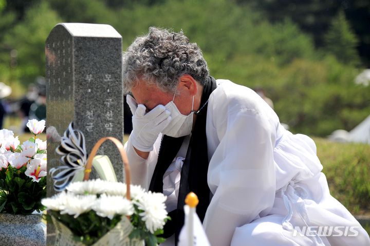 [광주=뉴시스] 이영주 기자 = 제42주년 5·18민주화운동 기념식 하루를 앞둔 17일 오전 광주 북구 운정동 국립5·18민주묘지에서 고 이정연 열사의 어머니 구선악(82) 여사가 오열하고 있다. 2022.05.17 leeyj2578@newsis.com |