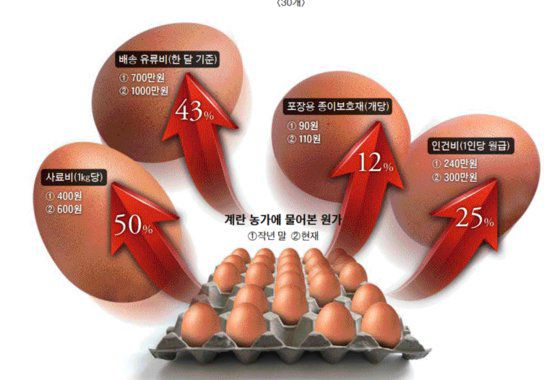 세계적인 인플레이션이 가계 식탁까지 삼키고 있음을 보여준다. 신종 코로나바이러스 감염증(코로나19)이 촉발한 에너지 가격 상승에 곡물 가격 상승 압박이 더해지면서 물가 상승을 주도하고 있었다. 원재료 가격 오름세가 생산 농가→중간 유통사→대형마트를 단계적으로 거치면서 계란 가격 상승으로 이어졌다.