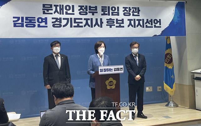 [더팩트ㅣ이새롬 기자] 유은혜 전 사회부총리 겸 교육부 장관, 전해철 전 행정안전부 장관, 권칠승 전 중소벤처기업부 장관이 18일 오전 경기도의회 브리핑룸에서 기자회견을 열고 김동연 경기도지사 후보 지지 선언을 하고 있다.