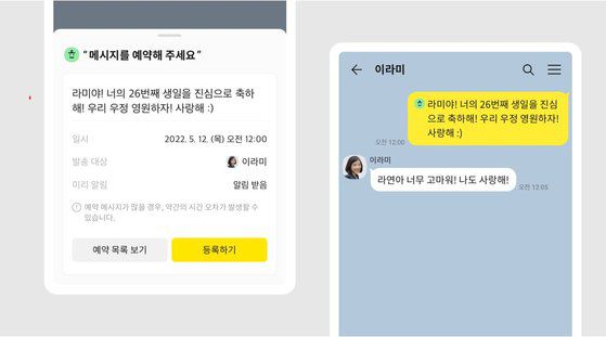 카카오톡에 예약 메시지 기능이 추가됐다. 생일 축하나 일정 등 메시지를 미리 저장한 날짜와 시간에 카톡을 보낼 수 있다.