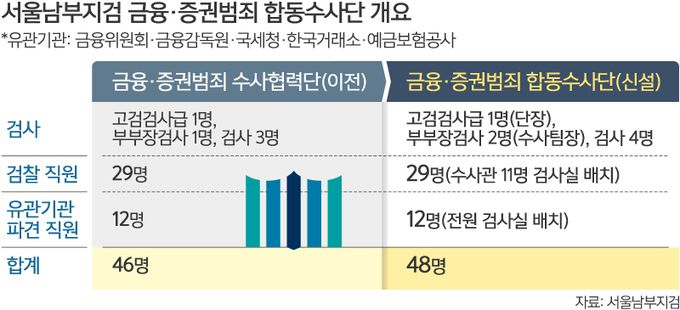 합수단은 시세 조종과 같은 자본시장 불공정거래 등 각종 금융·증권 범죄에 대응하는 조직이다. 검사 7명과 검찰 수사관, 특별사법경찰 등 48명으로 구성됐다. 예전 합수단(47명)이나 현재 협력단(46명)보다 규모가 커졌다. 단장은 고등검찰청 검사급이 맡고, 산하에 설치되는 합동수사 1·2팀장에는 부부장검사가 보임된다.