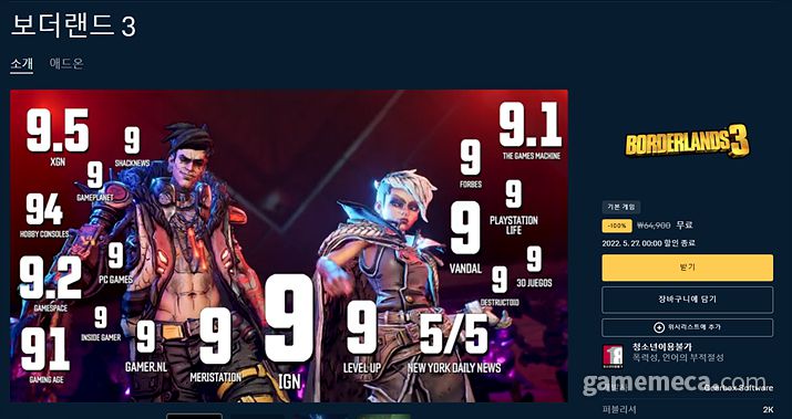 ▲ 보더랜드 3를 무료 배포 중인 에픽게임즈 스토어 (사진출처: 에픽게임즈 스토어) |