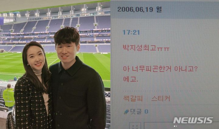 김민지는 20일 인스타그램에 "그리고 찾은 남편의 흔적ㅋ 2006년에도 박지성은 최고였던 모양으로 저때 압구정 로데오에서 친구들과 새벽경기를 봤었는데. 저 '박지성'이 지금의 내 남편이고 내가 낳은 만두들의 아빠라니. 인생이란 신기하군"라며 싸이월드에서 캡쳐한 사진 2장을 올렸다.