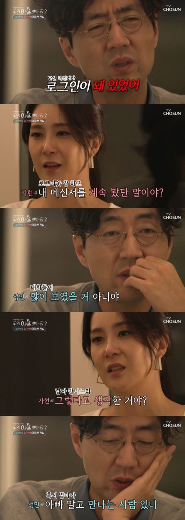 이날 방송에서 조성민은 장가현의 메신저 대화 내용을 본 적 있다고 고백했다. 조성민은 장가현에게 "(이혼 후) 내 작업 컴퓨터에 카카오톡 로그인 돼 있었다"며 "내가 오해의 소지를 가질만한 대화들이 있었다. 딸한테 엄마가 혹시 아빠 말고 만나는 사람 있냐고 물어봤다"고 밝혔다. 장가현은 "그걸 로그아웃 안 하고 다 봤단 말이냐"며 "남자가 생겨서 이혼하자 얘기한다 생각한 거냐"고 화냈다. 조성민은 "부정적으로 생각이 드니까 대수롭지 않은 대화들도 많은 상상을 하게 됐다"고 고백했다. 장가현은 "거의 6개월 이상을 본 거네"라며 "시어머니 15년째 누워계시고, 애 둘 키우고, 일하면서…. 난 사과만 하고 고맙다고 하려고 왔었다. 내 20년 충성, 우정, 사랑, 당신이 다 부정한 것 같다. 너무 억울하고 분하고 화나 미칠 것 같다"고 하염없이 눈물을 흘렸다.