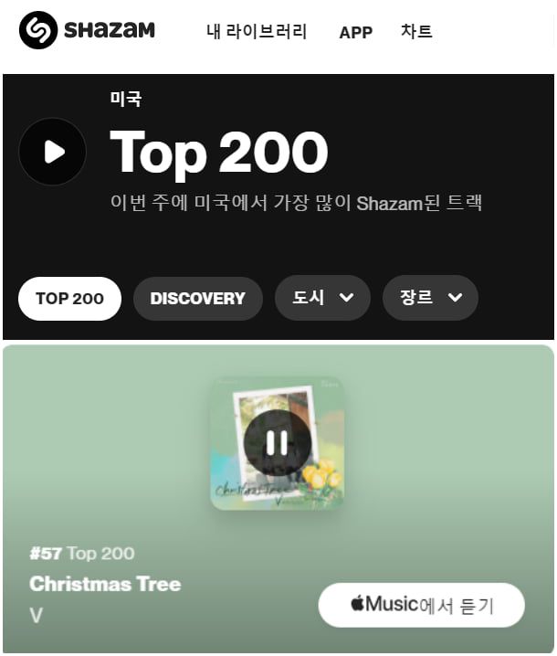 방탄소년단 뷔의 ‘Christmas Tree’가 K-OST 최초로 미국 샤잠 TOP100에 차트인했다.