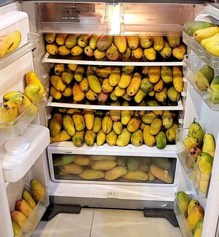허팝은 24일 자신의 SNS에 "망고 냉장고"라는 글과 함께 족히 300개가 넘는 망고가 칸칸이 들어찬 냉장실 사진으로 웃음을 안겼다.