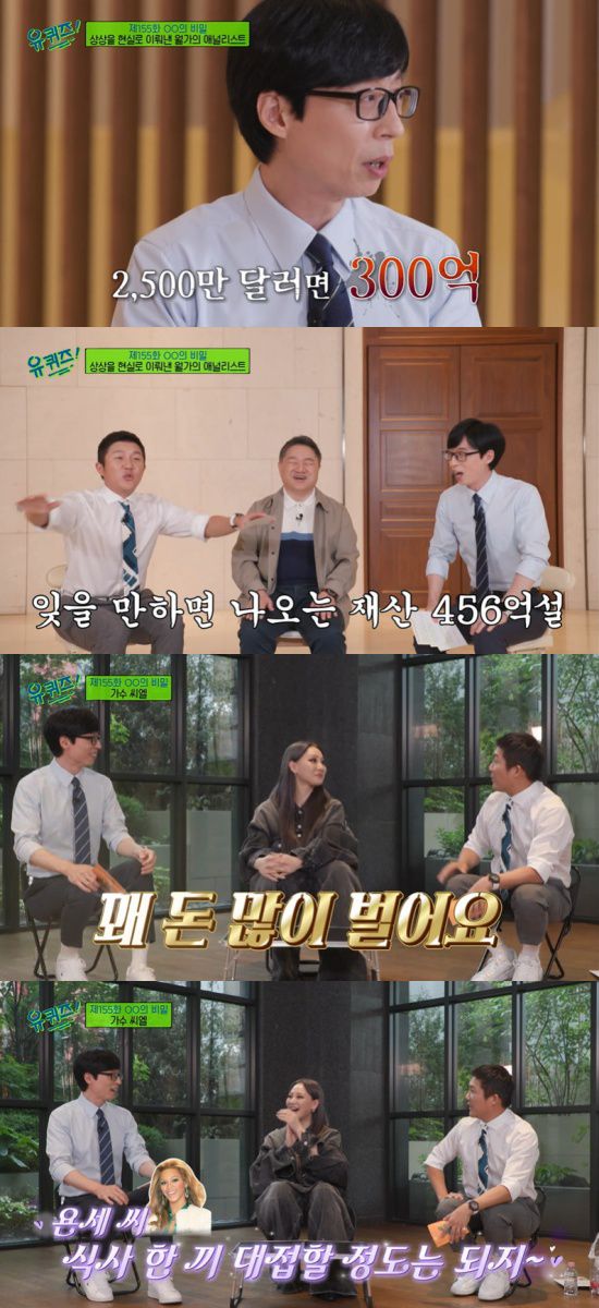 2500만 달러는 한화로 약 300억. 어마어마한 액수에 유재석은 크게 놀랐다. 신순규 애널리스트는 "왜냐면 (보유 자산이) 그 이하면 저희에게는 작은 고객이다. 세계적인 부호들과 가문들이 고객인 것 같다"라고 이야기해 또 한 번 충격을 선사했다.