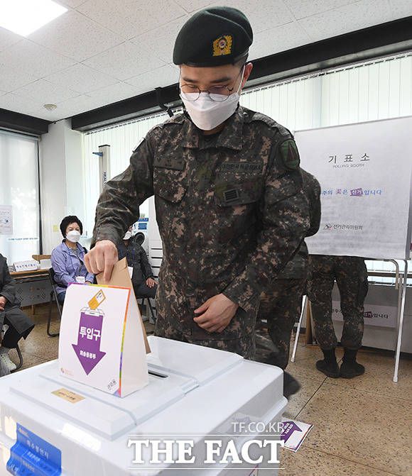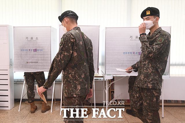 [더팩트ㅣ이동률 기자] 제8회 전국동시지방선거 사전투표 첫날인 27일 오전 서울 종로구 삼청동 주민센터에 마련된 사전투표소를 찾은 군인들이 투표를 하고 있다.