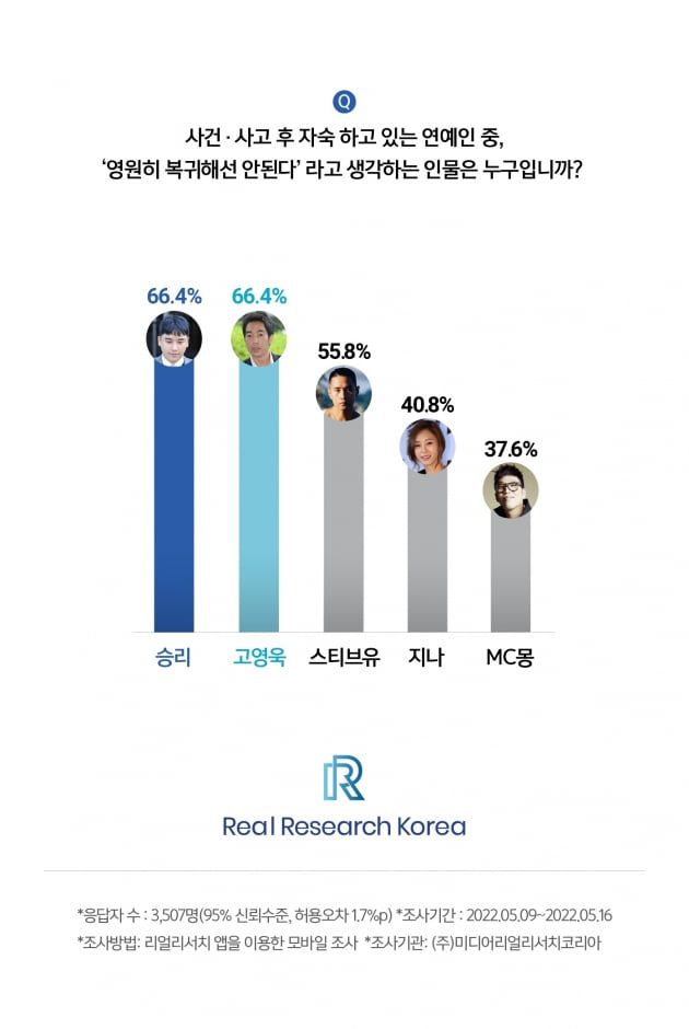 또한 ‘영원히 복귀하면 안되는 연예인’에 대한 개별 인물 조사(조사 항목 : 1.이제 복귀해도 됨 2.아직 복귀하면 안됨 3.영원히 복귀하면 안됨 4. 모름/응답거부)부분에서 가장 많은 답변을 차지한 인물 1위로는 빅뱅 전 멤버 승리와 룰라 출신 고영욱이 66.4%로 나란히 이름을 올렸다. 이어 스티브유(55.8%), 지나(40.8%), MC몽(37.6%)순으로 조사됐다.