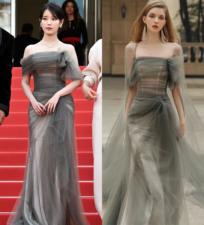 이날 아이유는 어깨 라인을 드러내는 오프숄더 튤 드레스를 착용했다. 슬림핏 디자인에 오묘하게 초록빛이 감도는 회색 드레스였다.