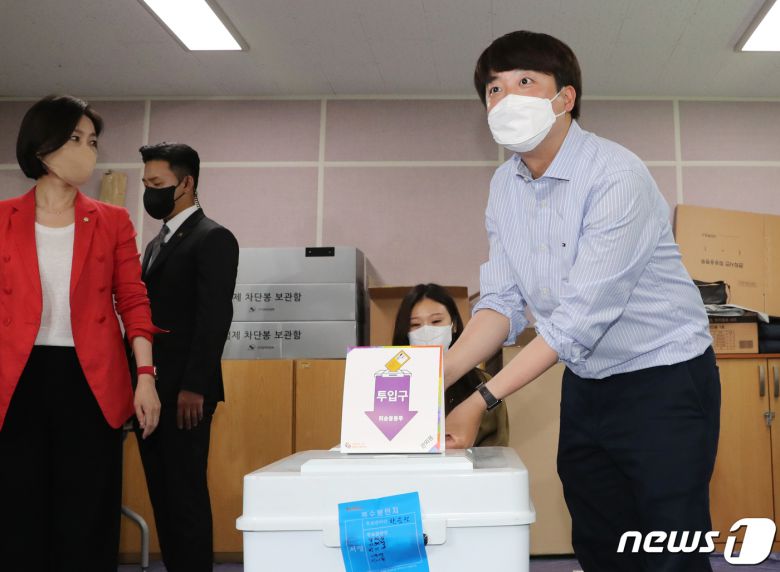 이준석 국민의힘 대표가 28일 오전 인천 계양구 계산2동행정복지센터에 마련된 사전투표소에서 투표를 하고 있다. 2022.5.28/뉴스1 © News1 이재명 기자