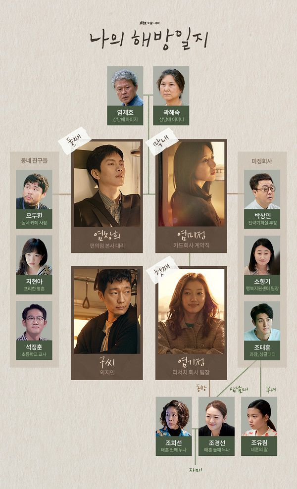 인물관계도 속 염창희(이민기 분), 염미정(김지원 분), 염기정(이엘 분) 삼 남매는 각자의 인생에서 변화를 맞았다. 언제나 남들의 기준에 맞춰 끌려가던 염창희는 자신이 욕망 없는 인간이라는 걸 깨닫고 회사를 그만뒀고, 염미정은 구씨와의 만남 이후 공허하던 내면을 채워나갔다. 한편 사랑으로 해방을 꿈꿨던 염기정은 싱글대디 조태훈(이기우 분)과 연애를 시작했다. 그러나 이들의 변화는 여기서 끝이 아니었다. 삼 남매의 어머니 곽혜숙(이경성 분)이 세상을 떠나면서 힘든 시간을 겪어야 했고, 염미정은 구씨와 이별했으며, 염기정에게는 조태훈의 가족들이라는 넘어야 할 또 다른 산이 나타났다. 이들은 끝내 행복을 찾을 수 있을까. 이들이 원하는 인생의 '해방'이란 결국 어떤 의미일까. 견딜 수 없이 촌스러운 삼 남매의 견딜 수 없이 사랑스러운 인생 이야기가 어떤 마침표를 찍고 다음 문장으로 나아갈지 궁금해진다.