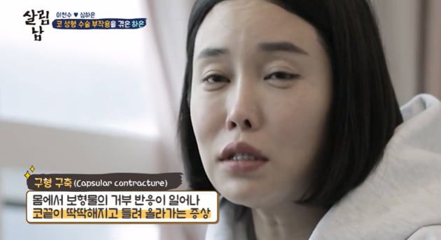 이어 "부작용으로 구형 구축이 생겼다. 모양도 변하고 축소되고 쪼그라들고"라고 덧붙였다. 구형 구축은 몸에서 보형물의 거부 반응이 일어나 코끝이 딱딱해지고 들려 올라가는 증상. 심하은은 "그때부터 비염도 왔다. 한쪽만 막혔는데 이번엔 양쪽 다 막혔다"고 설명했다.