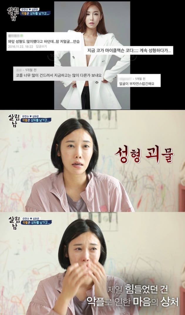 심하은은 "입이랑 코가 하나라 붙겠다고!"라고 화를 냈다. 그는 "제가 찾아보지 않아도 SNS에 찾아와서 댓글을 쓰거나 DM을 보내는 사람이 있다. 성과(성형괴물)다. 그래도 괴물까진 아닌데"라며 "동네 분들은 실물이 더 예쁘다고 해주신다. 일상생활의 불편함도 있지만 마음의 상처가 있긴 있다"며 울컥했다.